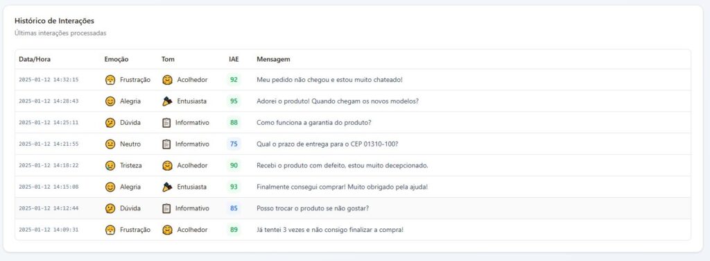 Registro completo: emoção, tom ideal, tom da IA, resposta final, comprimento e IAE. Transparência total para equipes de comunicação.